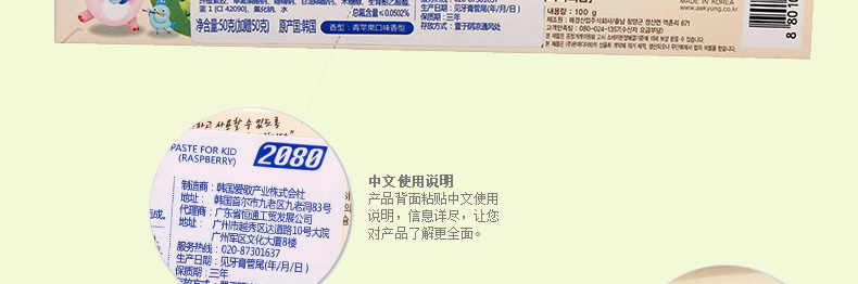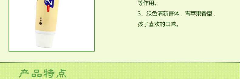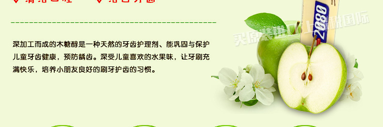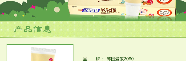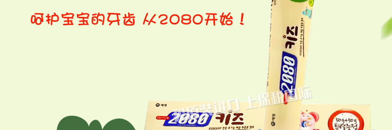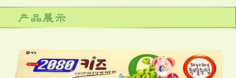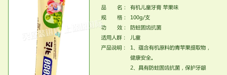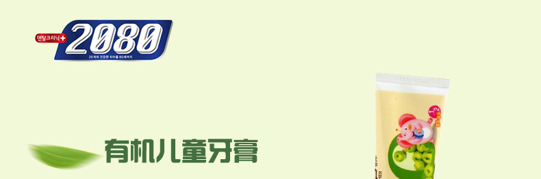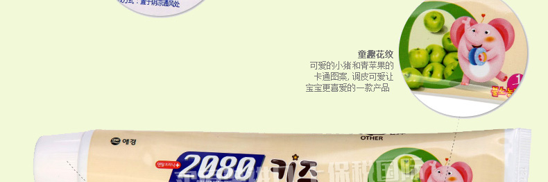韓國愛敬2080有機兒童牙膏 蘋果味 防蛀固齒抗菌 護理牙齦 100g/支—— 1、蘊含有機原料的青蘋果提取物,健康安全。 2、具有防蛀固齒抗菌,保護牙齦等作用。 3、綠色清新膏體,青蘋果香型,孩子喜歡的口味。 |