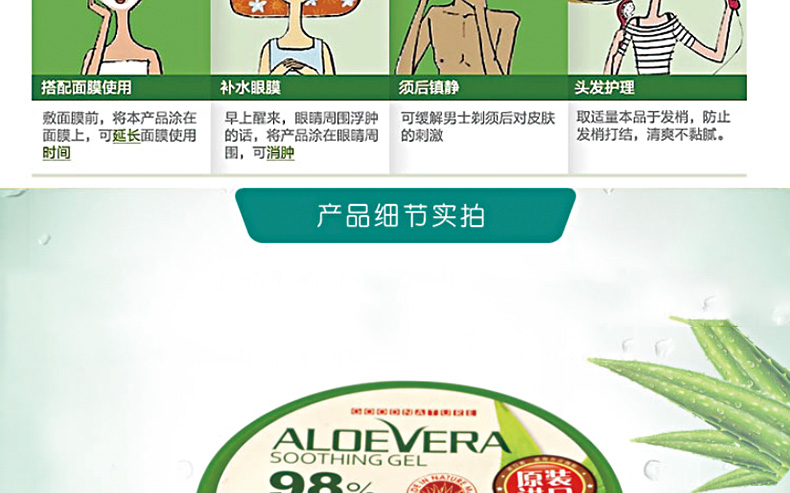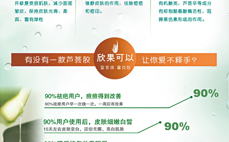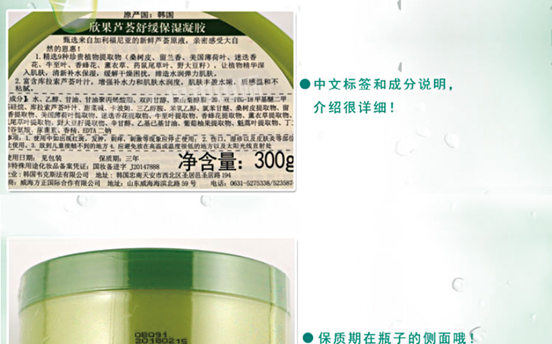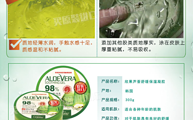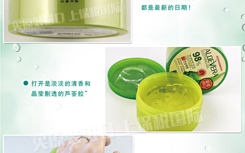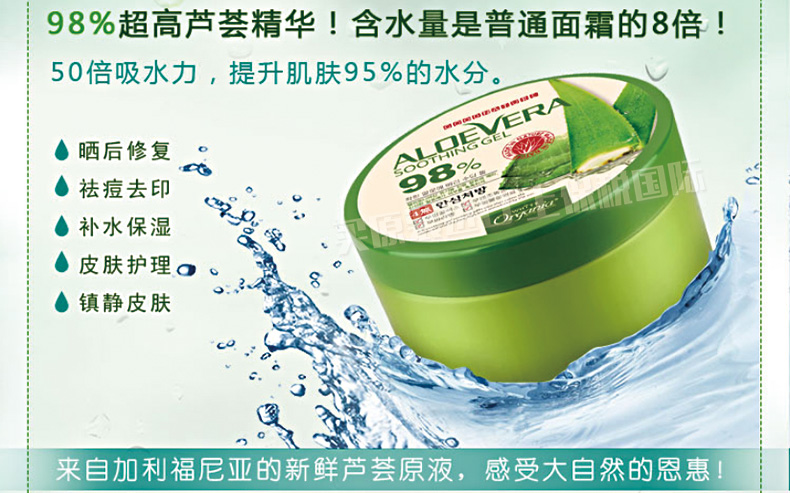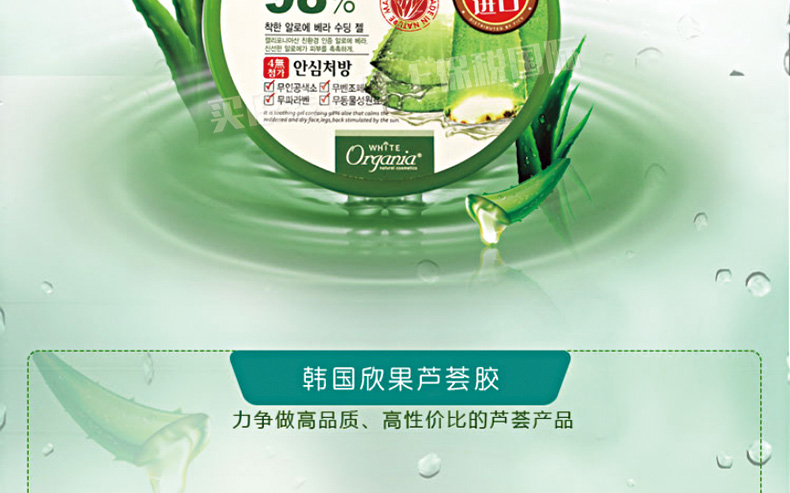 韓國欣果蘆薈舒緩保濕凝膠 蘆薈膠 補水保濕 曬后修復 鎮靜舒緩 300g/盒—— 1、富含98%的蘆薈精華成分。 2、蘊含精選的9種珍貴植物提取物。 3、補水保濕,鎮靜舒緩,曬后修復樣樣行。 |