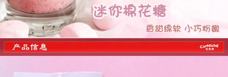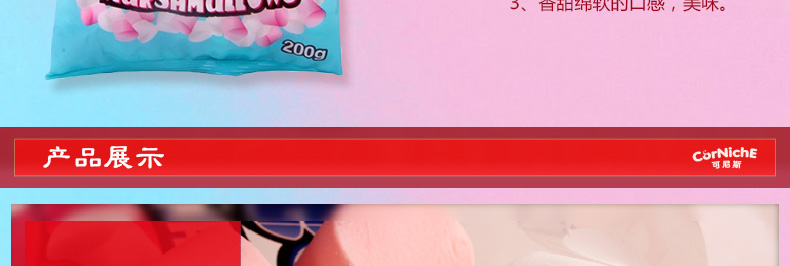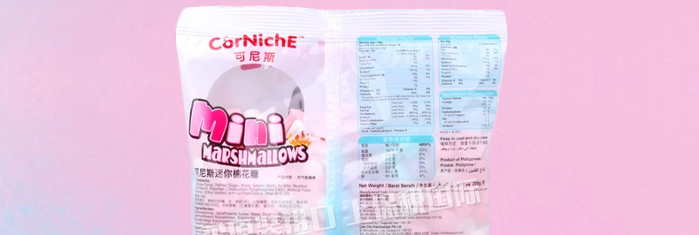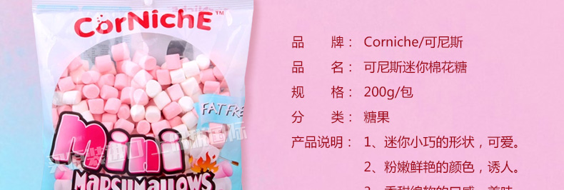 菲律賓Corniche 可尼斯迷你棉花糖 香甜綿軟 小巧粉嫩 200g/包—— 1、迷你小巧的形狀,可愛(ài)。 2、粉嫩鮮艷的顏色,誘人。 3、香甜綿軟的口感,美味。 |