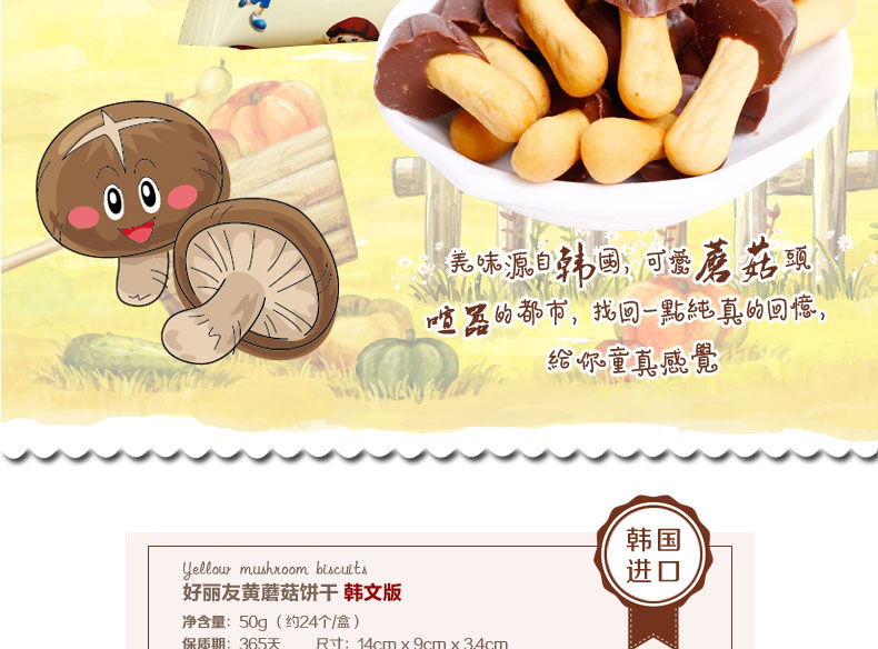 韓國好麗友黃蘑菇巧克力餅干 寶寶營養餅干 蘑菇狀餅干 松脆香濃 50g/盒—— 1、具有巧克力的香濃味道,松脆的口感。 2、獨特蘑菇形狀,增添童趣無限。 |