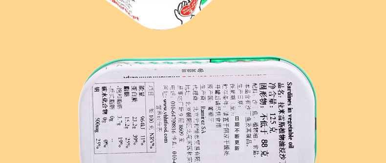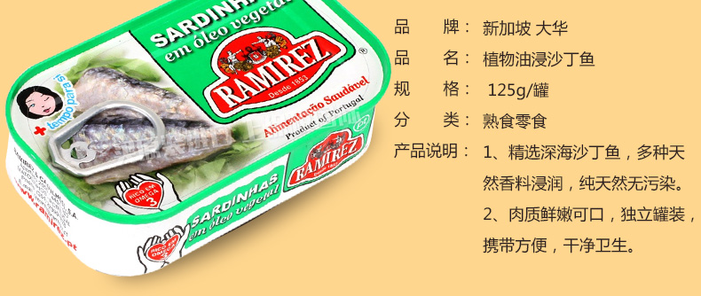 葡萄牙 拉米雷斯Ramirez植物油浸沙丁魚 即食魚罐頭 非油炸休閑熟食125g/罐—— 1、精選深海沙丁魚,多種天然香料浸潤,純天然無污染。 2、肉質(zhì)鮮嫩可口,獨立罐裝,攜帶方便,干凈衛(wèi)生。 |