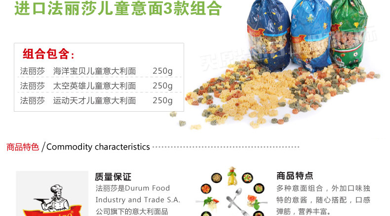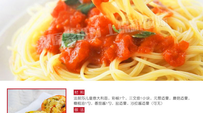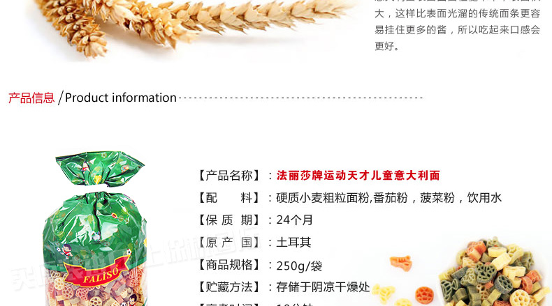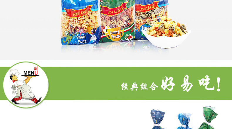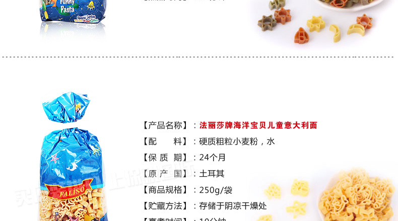 土耳其FALISO/法麗莎兒童意大利面 海洋寶貝/運動天才/太空英雄 爽滑有嚼勁 250g/袋—— 1、精選優質小麥和硬質粗粒面粉精制。 2、適合兒童腸胃環境,易消化,不含防腐劑。 3、造型獨特可愛,增添孩子吃面的樂趣。 |