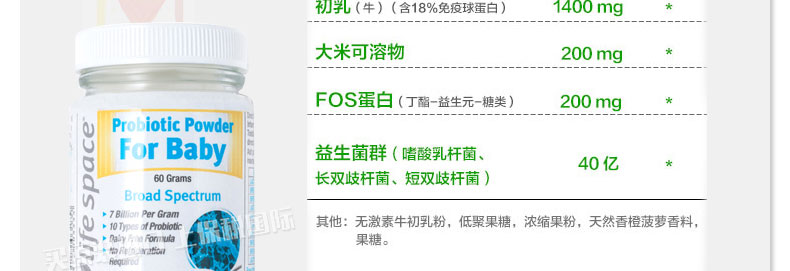 0-3歲寶寶益生菌粉 改善濕疹 呵護腸道 提高免疫力 Life Space品牌正品 60g/瓶—— 1、每克益生菌粉富含10億天然活性益生菌。 2、改善濕疹和過敏,呵護腸胃健康,增強免疫力。 3、開封后儲存于24度以下的陰涼干燥處,4個月內服用完畢。 |