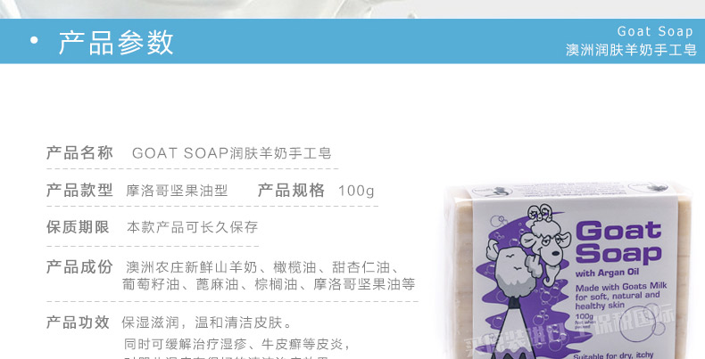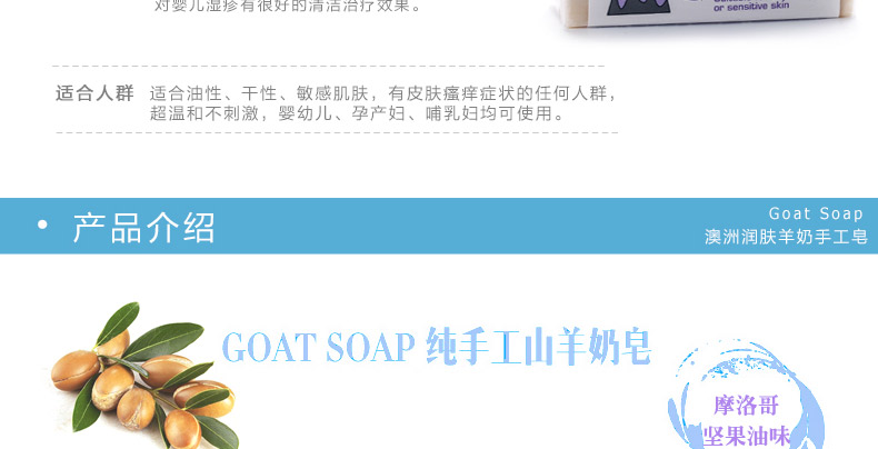 商品名稱 | Goat摩洛哥堅果油羊奶皂 溫和清潔不刺激 澳大利亞原裝進口 100g/塊 | ||