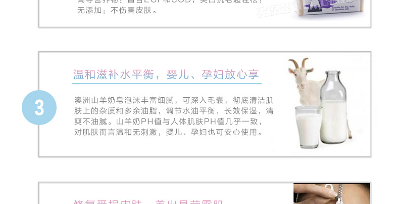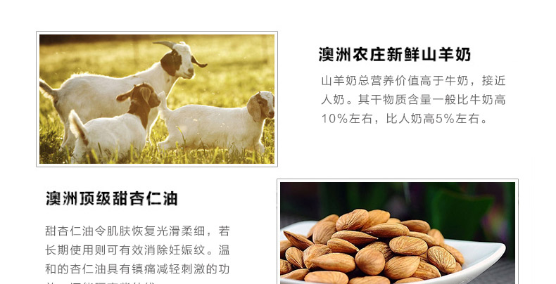 1、采用澳洲農莊的新鮮山羊奶和天然摩洛哥堅果油制造。 2、性質溫和,不刺激皮膚,能夠緩解皮膚干燥發癢癥狀。 3、持久使用,使肌膚變得柔軟,光滑,滋潤。 |