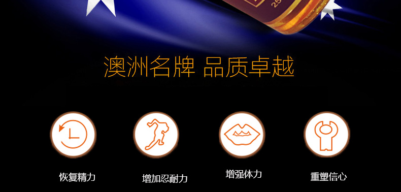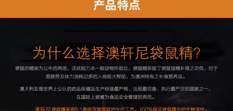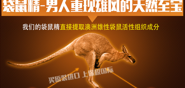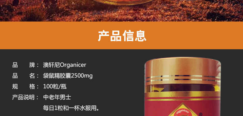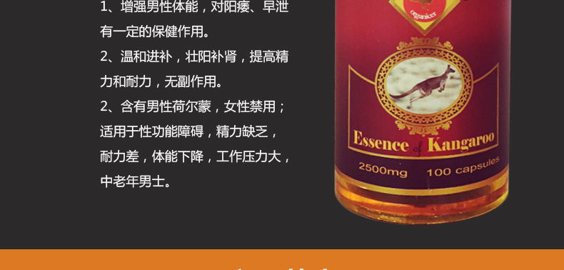 澳洲Organicer澳軒尼袋鼠精膠囊2500mg 益腎強精改善亞健康的男性保健品 100粒/瓶—— 1、增強男性體能,對陽痿、早泄有一定的保健作用。 2、溫和進補,壯陽補腎,提高精力和耐力,無副作用。 2、含有男性荷爾蒙,女性禁用;適用于性功能障礙,精力缺乏,耐力差,體能下降,工作壓力大,中老年男士 |