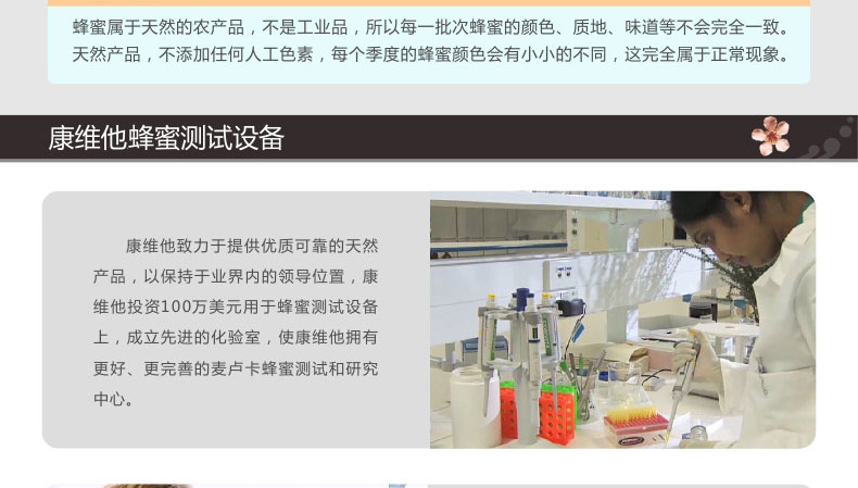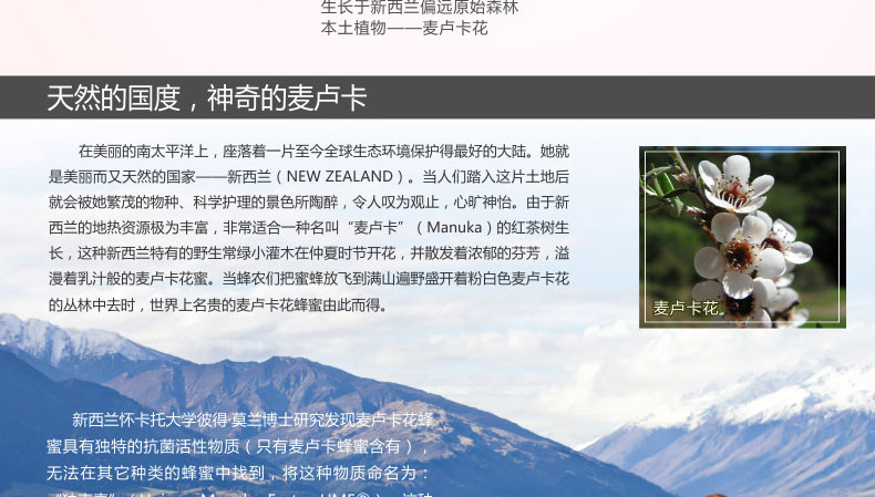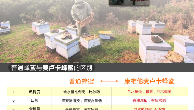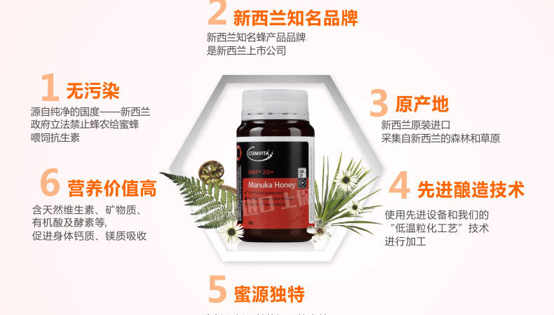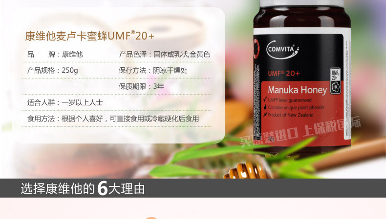 麥盧卡蜂蜜UMF20+ 康維他麥盧卡蜂蜜 胃病必備蜂蜜 新西蘭進口 250g/瓶—— 1、100%純天然麥盧卡蜂蜜,蘊含豐富的活性因子。 2、補充能量,呵護腸胃健康,提高抵抗力。 3、口味濃香甘甜,色澤醇厚。 |
