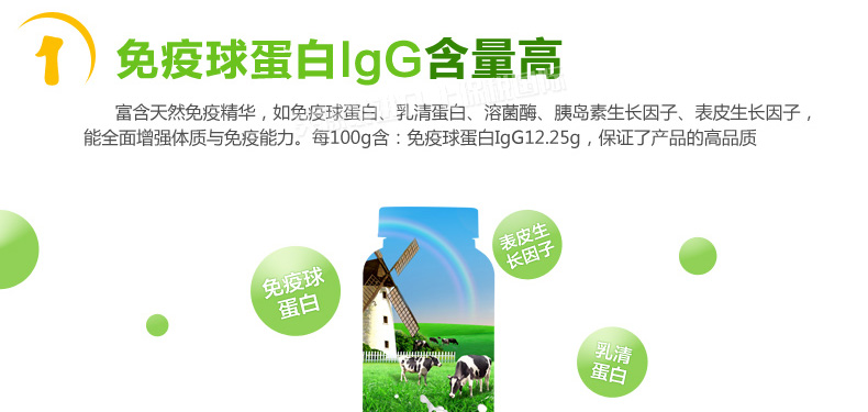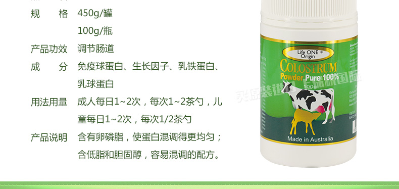生命一號牛初乳粉 20%免疫球蛋白 調節腸道 促進骨絡牙齒生長—— 1、成人每日1~2次,每次1~2茶勺,兒童每日1~2次,每次1/2茶勺. 2、含有卵磷脂,使蛋白混調得更均勻;含低脂和膽固醇,容易混調的配方。 |