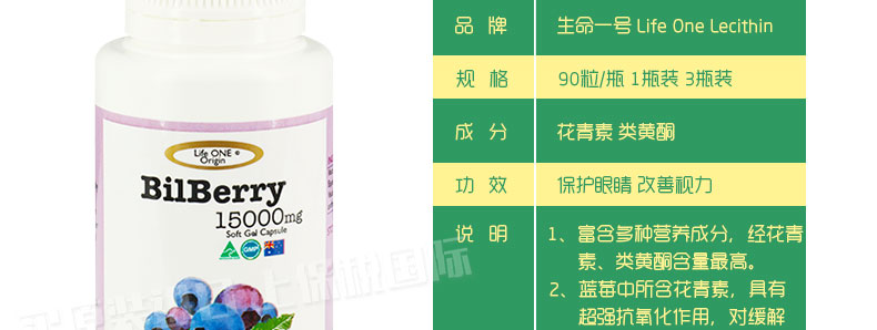 生命一號藍莓素軟膠囊15000毫克 保護眼睛 改善視力 90粒/瓶 1瓶裝 3瓶裝—— 1、富含多種營養成分,經花青素、類黃酮含量最高。 2、藍莓中所含花青素,具有超強抗氧化作用,對緩解視疲勞、改善視力等效果明顯。 |