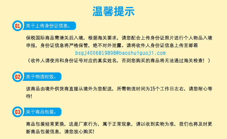 | 權利聲明: 保稅國際的所有商品信息、客戶評價、商品咨詢等內容,是保稅國際重要的經營資源,未經許可,禁止非法轉載使用。 注:本站所有商品均為原裝進口商品,境外直郵,全程海關監管,假一罰十,對任何冒用保稅國際行銷的行為,本站將追究法律責任,請放心購買。 |
