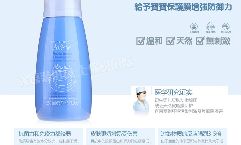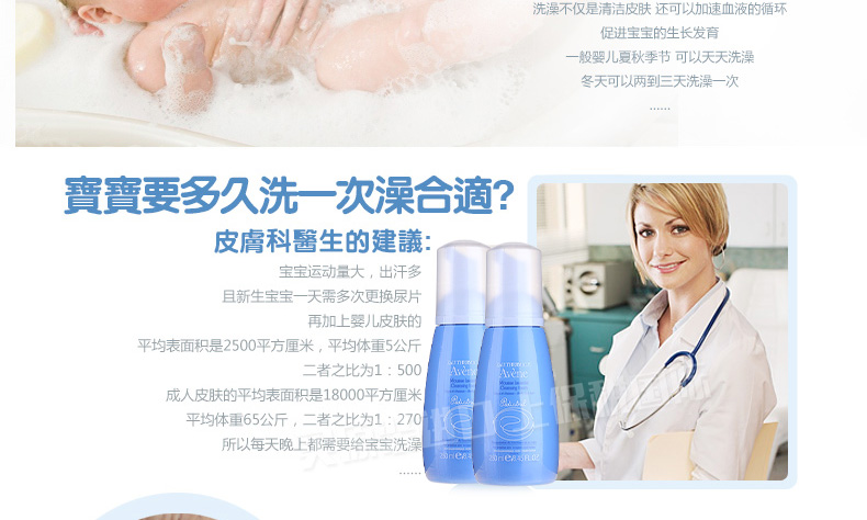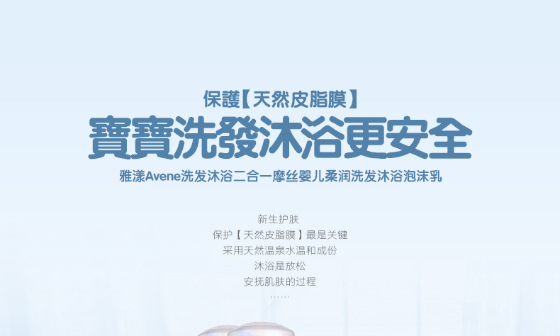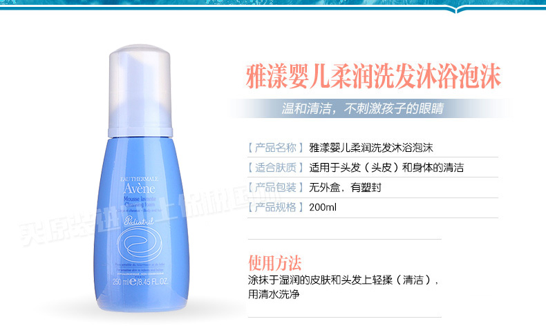 雅漾Avene洗發沐浴二合一摩絲嬰兒柔潤洗發沐浴泡沫乳 無香不刺激 250ml/瓶—— 1、不含皂基,性質溫和不刺激。 2、溫和清潔污垢,保護皮脂膜。 3、洗發水,沐浴露雙效合一。 |