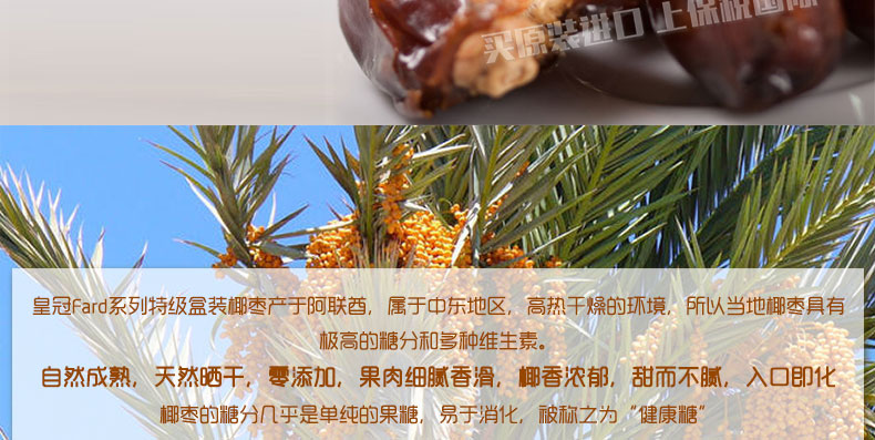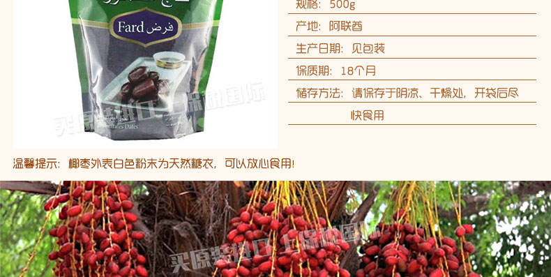 阿聯酋皇冠特級椰棗 Fard系列袋裝椰棗 甜而不膩 清真食品 辦公旅游休閑小零食 500g/袋—— 1、阿聯酋純天然原裝進口的蜜餞食品。 2、口感軟綿,甜度適中不黏膩。 3、方便攜帶的袋裝椰棗,隨時隨地,想吃就吃。 |
