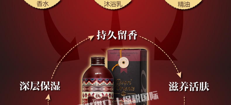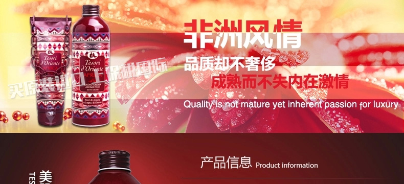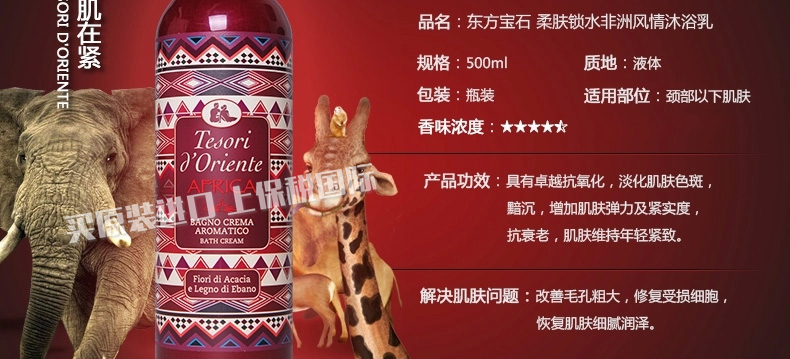 2瓶裝 東方寶石 非洲風(fēng)情柔膚祛黃淡斑凈化黑色素沐浴乳 Tesori d’Oriente鎖水沐浴露500ml/瓶*2—— 1、降低肌膚混合油脂,抑制過(guò)剩油脂分泌,讓肌膚徹底告別黯啞。 2、混合著木香和辛香的溫和性感芳香,讓您像是走進(jìn)非洲大陸。 3、取適量產(chǎn)品于濕毛巾或浴棉上輕揉按摩肌膚。 |