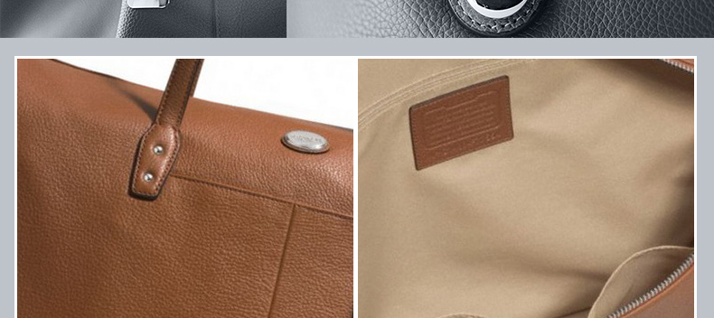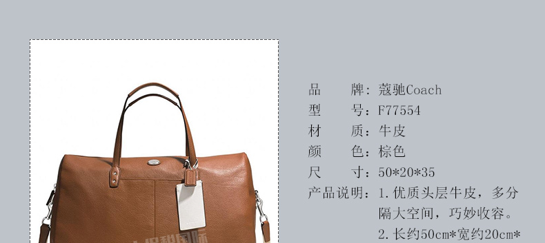 蔻馳Coach 中號棕色粒面牛皮手提旅行包 中性手提包男女都適用包包F77554—— 1.優質頭層牛皮,多分隔大空間,巧妙收容。 2.長約50cm*寬約20cm*高約35cm(由于測量手法不同,誤差1cm-3cm屬正常范圍)。 |