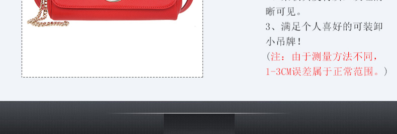 蔻馳新款單肩斜跨鏈條女包F34604 米色/紅色任選 美國Coach時尚女包—— 1、優質五金,其光亮度和質感是產品一大亮點。 2、柔軟真皮材質,紋理清晰可見。 3、滿足個人喜好的可裝卸小吊牌! 注:由于測量方法不同,1-3CM誤差屬于正常范圍。 |