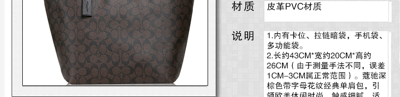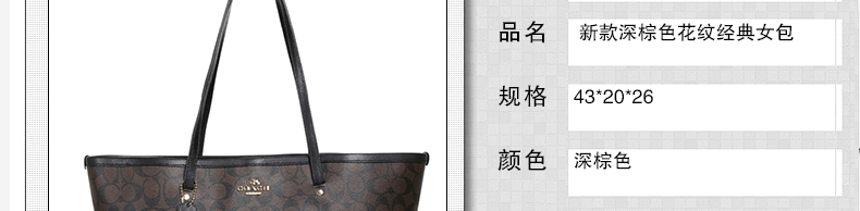 蔻馳Coach 新款深棕色花紋經(jīng)典女包 皮革PVC材質(zhì)拉鏈口單肩手提包 F34104—— 1.內(nèi)有卡位、拉鏈暗袋,手機(jī)袋、多功能袋。 2.長(zhǎng)約43cm*寬約20cm*高約26cm(由于測(cè)量手法不同,誤差1cm-3cm屬正常范圍)。 |