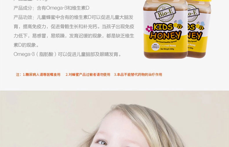 澳洲Bio-E兒童檸檬蜂蜜Kid Honey 含omega-3+維生素D 調節腸胃 提高免疫 500g/瓶—— 1、天然無污染,無激素,味道甜而不膩。 2、補充維生素,調節腸胃,提高免疫力。 3、有豐富的,檸檬般的氣味。 |