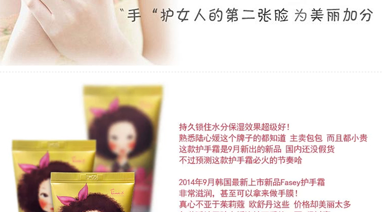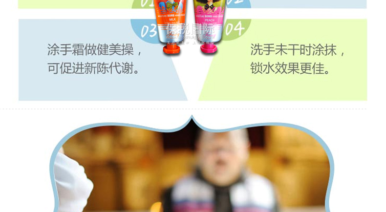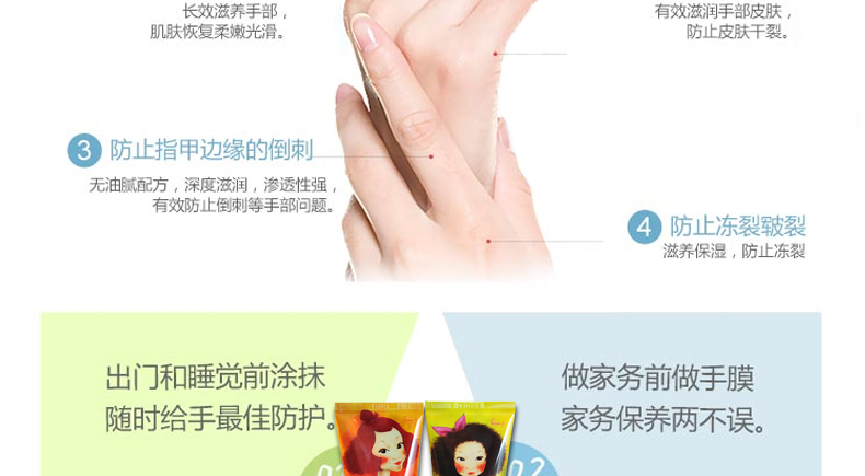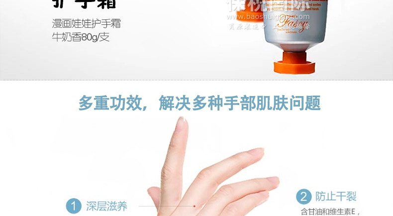 1.兼顧護手霜與手膜雙重功效,防止擊鼓干燥粗糙,呈現嬰兒般的細膩肌膚。 |