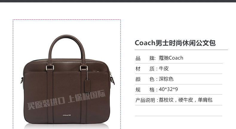 蔻馳深棕色荔枝紋硬牛皮男士單肩手提包F71681 Coach男士時尚休閑公文包—— 1、長*寬*高:40*32*9。 2、荔枝紋,硬牛皮,單肩包。 3、時尚休閑男士公文包。 |