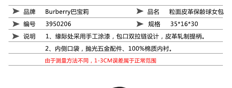 巴寶莉Burberry 純黑色中號粒面牛皮保齡球女包3950206 經(jīng)典百搭女士手提包—— 1、緣際處采用手工涂漆,包口雙拉鏈設(shè)計,皮革軋制提柄。 2、內(nèi)側(cè)口袋,拋光五金配件、100%棉質(zhì)內(nèi)襯。 |