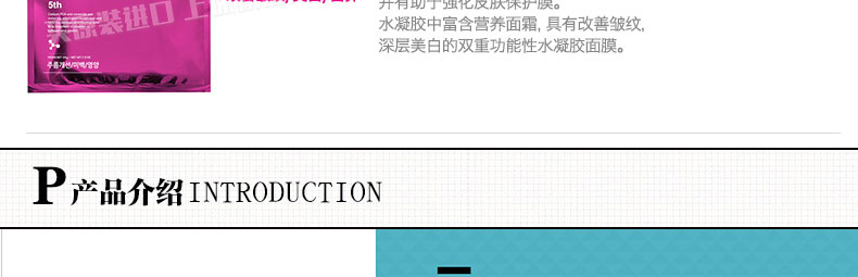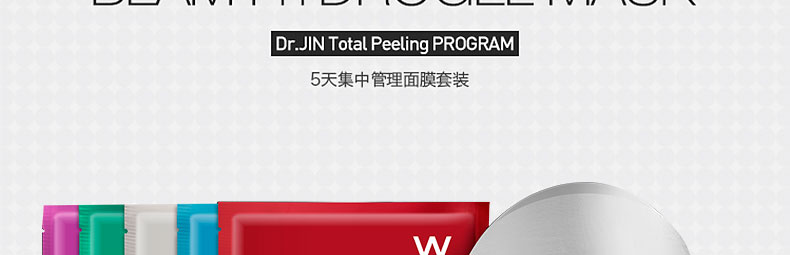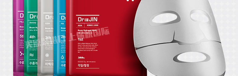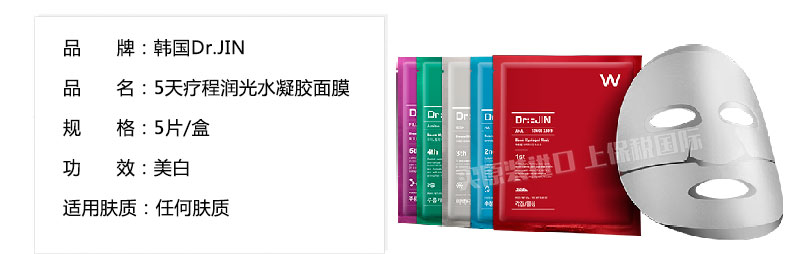 韓國 Dr.JIN 5天療程潤光水凝膠面膜 集中美白淡斑面膜套裝 5片/盒—— 1、紅色裝,富含AHA去除肌膚表面老化角質,鎮靜保濕。 2、藍色裝:含有水動力的玻尿酸,增強肌膚彈性。 3、灰色裝:美白凈化肌膚,擁有好氣色。 4、綠色裝:給肌膚提供充足水分,改善皺紋。 5、紅色裝:含有PCA鈣和神經酰胺,增強皮膚彈性、改善皺紋。 |