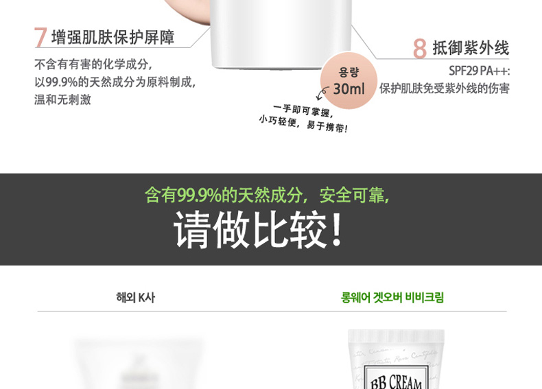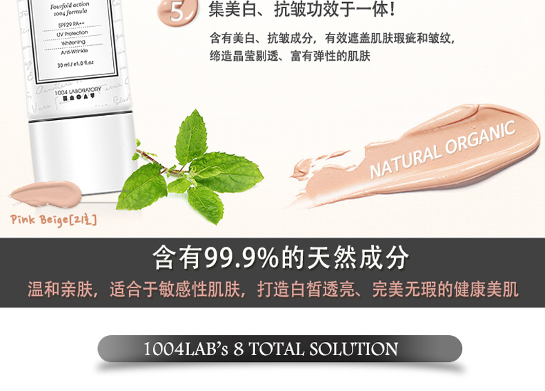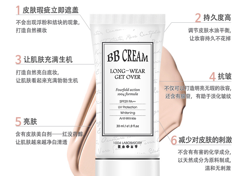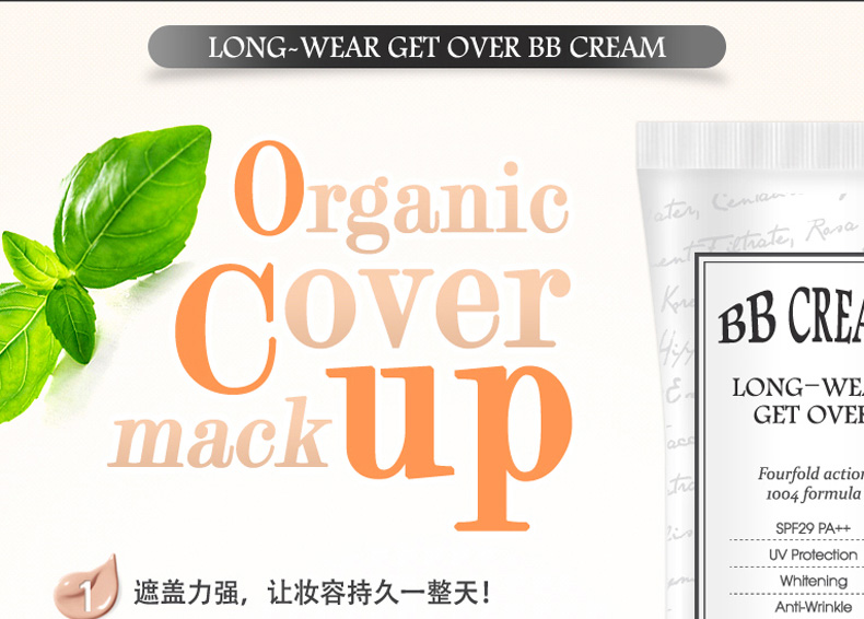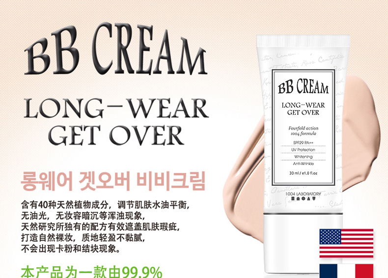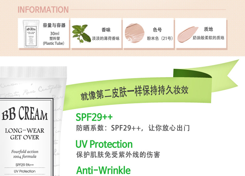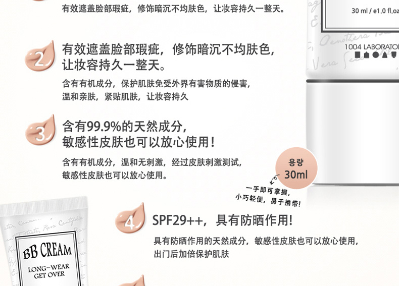 韓國Long Wear Get-Over BB霜SPF29++ 21#粉米色 持妝抗皺 薄荷清香的1004lab品牌BB霜 30ml/支—— 1、具有淡淡薄荷香味的BB霜。 2、奶油般的柔軟質地,延展性強。 3、含抗皺成分,持久妝效,提亮膚色。 |