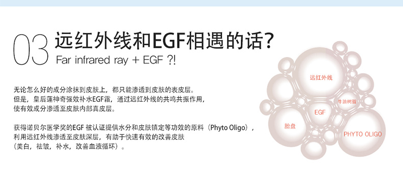皇后蓮 神奇EGF補水面霜 補水祛皺美白 讓你的肌膚水水嫩嫩 50ml/瓶—— 1.EGF細胞再生粒子能有效強化皮膚壁膜,改善皺紋,美白和減少斑點等。 2.遠紅外線可以排除廢棄物和毒素,分解血點促進血液循環(huán),凈化血液。 3.可以搭配皇后蓮的精華油一起使用(1-2滴)也可以和皇后蓮噴霧搭配使用(2-3次) |