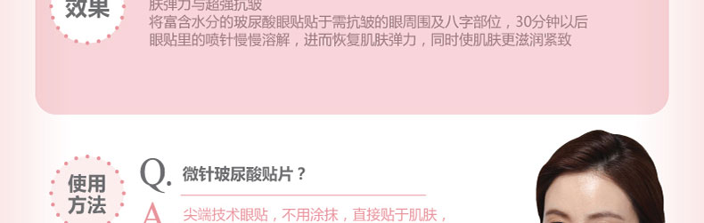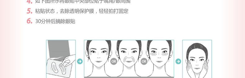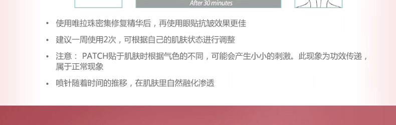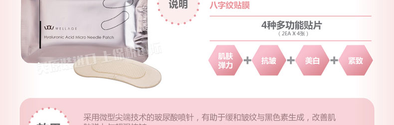 韓國唯拉珠抗皺彈力眼貼膜 美白緊致 4重功效眼貼護膚品化妝品 2EA*4張/盒—— 1、抗皺,彈力,美白,緊致,多功能眼貼。 2、有效成分直達肌膚深處,更安全。 3、不需涂抹,輕輕一貼,迅速滲透肌膚! |