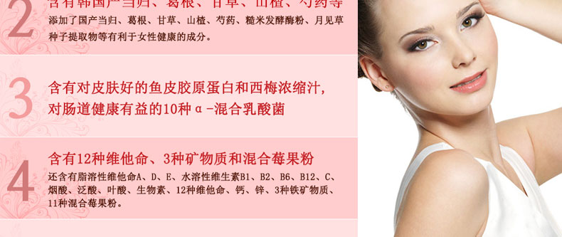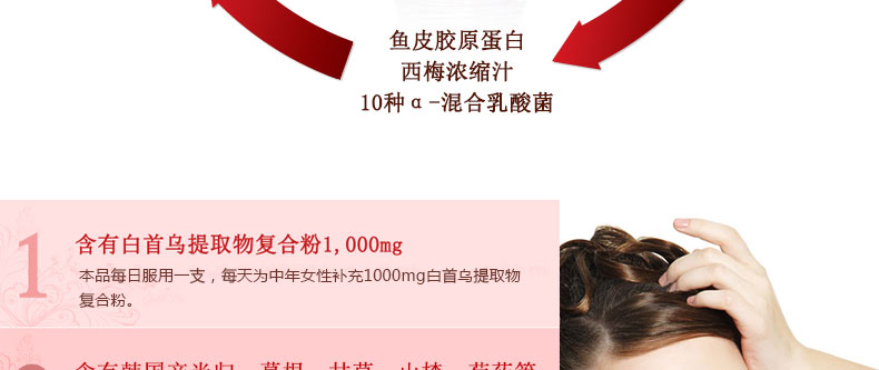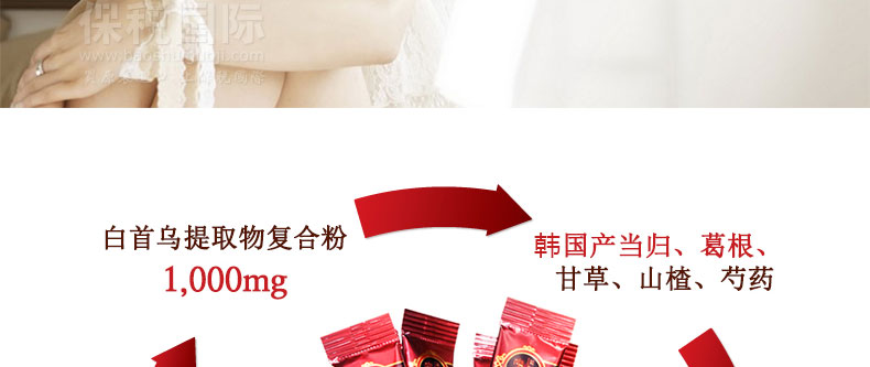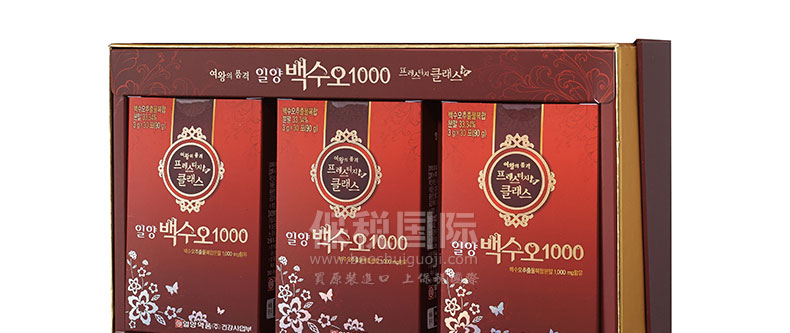 | 產品說明 | 韓國[一洋藥品] 白首烏1000 90包裝 270g—— 1、含有白首烏提取物復合粉1000mg。 2、含有國產當歸、葛草、甘草、山楂、芍藥等。 3、含有對皮膚好的魚皮膠原蛋白和西梅濃縮汁。 4、含有12種維他命、3種礦物質和混合莓果粉。 5、便于攜帶的小袋包裝,方便食用。 | |||