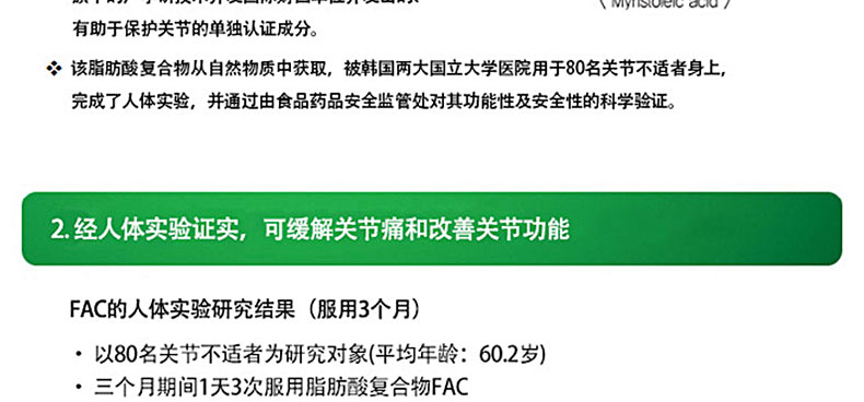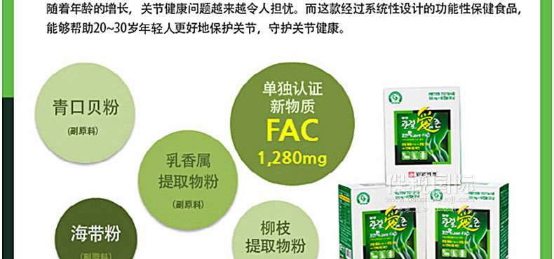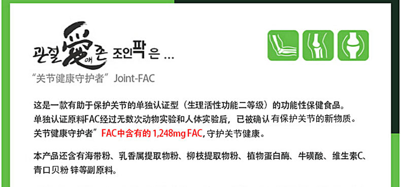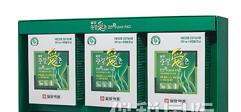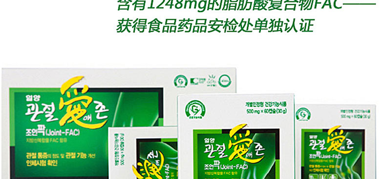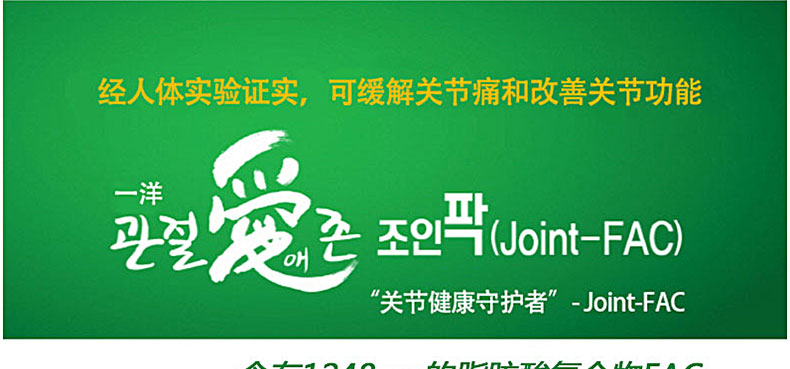韓國[一洋藥品] 愛關節Joint-FAC脂肪酸復合物營養片 守護關節健康 一盒裝兩盒裝 60粒*3瓶/盒 —— ①含有單獨認證原料FAC,有助于保護關節的功能保健食品。 ②含有海帶粉,青口貝粉,乳香提取物,維生素C等其他營養成分。 ③幫助20~30歲的青年人更好的保護關節,守護關節健康。 |