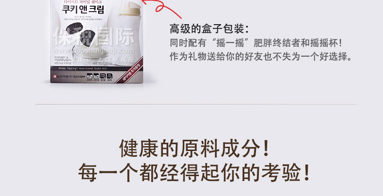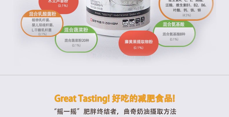 | 產(chǎn)品說明 | 韓國[一洋藥品] 減少體脂肪系列 曲奇奶油粉 750g—— 1、每天一頓,簡單又方便的健康減肥法; 2、保持勻稱身材的同時均衡補充營養(yǎng); 3、帶來咀嚼趣味,味道和營養(yǎng)一個都不少! 食用方法:一天1~2次 一次約2勺(25g) 和牛奶或豆?jié){(200ml)一塊沖著喝。? | |||