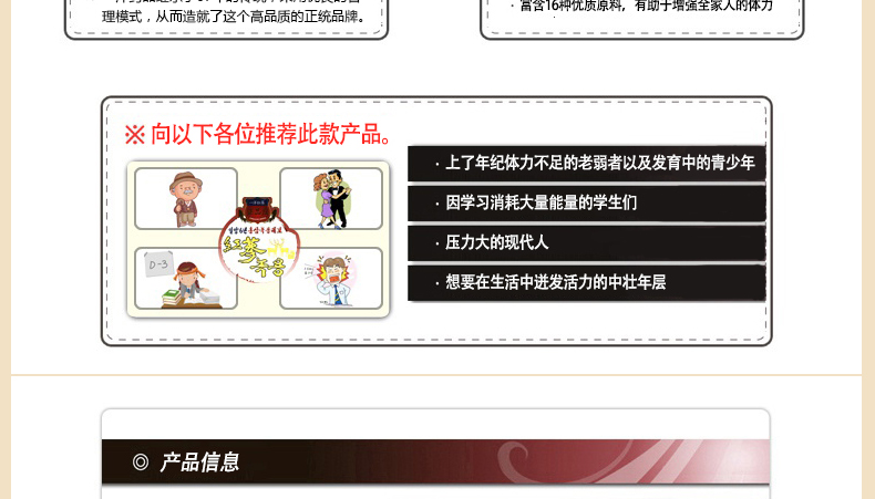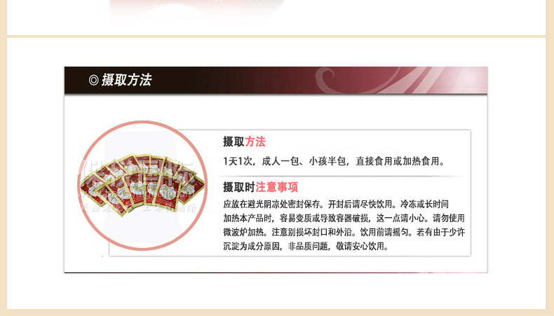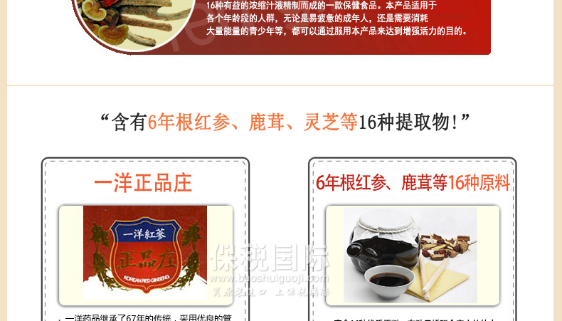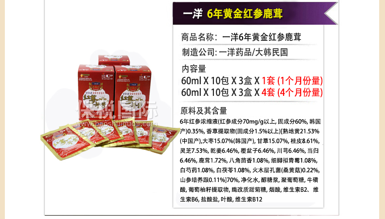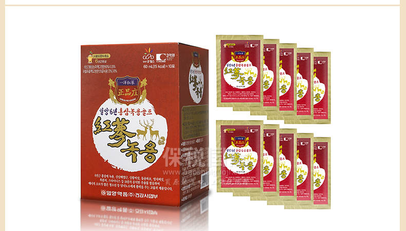 | 產品說明 | 韓國[一洋藥品] 正品莊 六年紅參鹿茸? 30包 1個月量 1800g—— 1、應放在避光陰涼處密封保存; 2、開封后請盡快飲用; 3、冷凍過長時間,加熱本產品時,容易變質或導致容器破損; 4、請勿使用微波爐加熱。注意別損壞封口和外沿; 5、飲用前請搖勻。若有少許沉淀為成分原因,非品質問題,敬請安心飲用。 | |||
