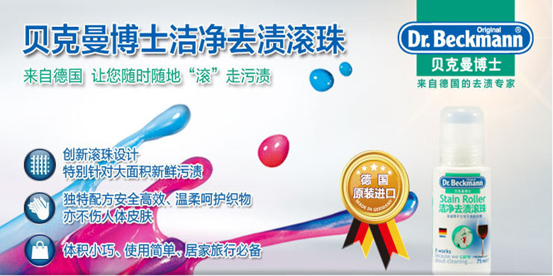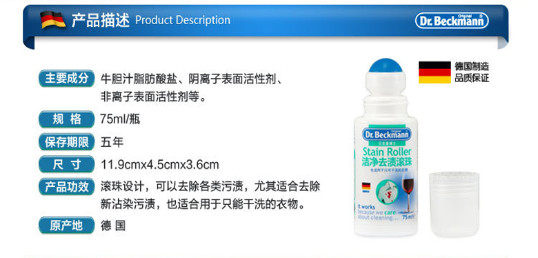 德國貝克曼博士便攜式衣服免洗去漬滾珠去污筆干洗清潔劑去紅酒漬污漬75ml/瓶