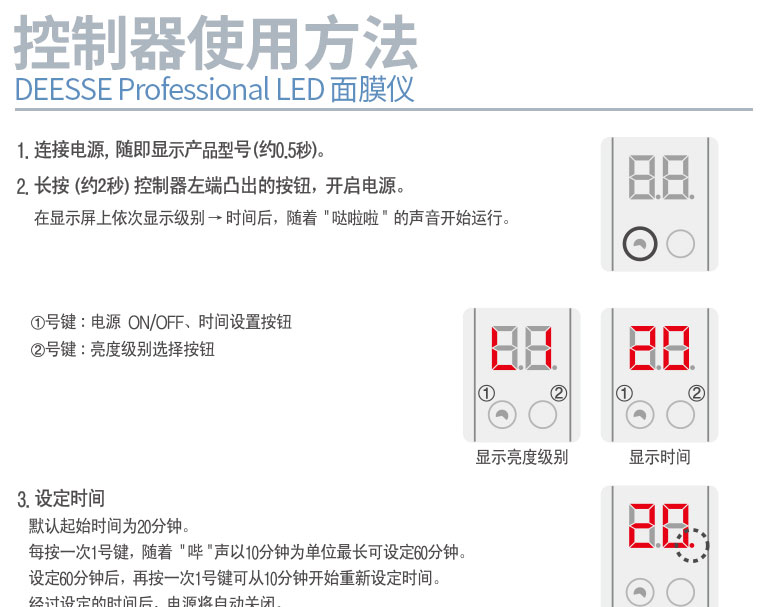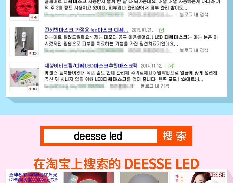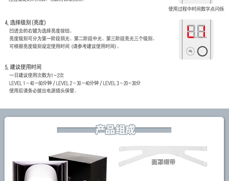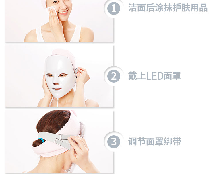 韓國明星 DEESSE LED 美容面膜儀 光能美容儀 美白嫩膚淡斑除皺美容工具 1套 —— 1、輕薄的設計,優雅的外光,方便攜帶,適用各種臉型。 2、172顆高質量LED生物光芯片,360度光照無死角全覆蓋。 3、獨有的眼部保護系統保護眼部免受刺激和傷害。 4、產品構成:面膜儀包裝盒、控制器、適配器、面罩繃帶、使用說明書。 使用方法:潔面后涂抹護膚品,戴上LED面罩,調節面罩繃帶;開機并設定時間及亮度級別,開始享受皮膚護理。 |