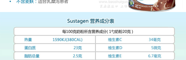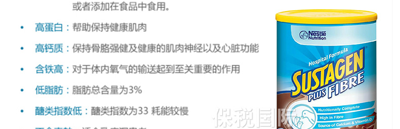 | 產(chǎn)品說明 | Nestle雀巢SUSTAGEN plus孕婦牛奶粉加纖維巧克力味900g/罐—— Sustagen Plus Fibre的高纖維配方幫助腸胃消化吸收,適合成人飲用。加入纖維的本產(chǎn)品含有與醫(yī)用配方一樣的營養(yǎng),加入纖維可促進(jìn)健康消化系統(tǒng)。植物纖維是碳水化合物,它通過身體在結(jié)腸內(nèi)參與部分菌致分解的消化過程。加入纖維的本產(chǎn)品是飲食營養(yǎng)專家特別為飲食營養(yǎng)攝取不足而設(shè)計(jì)的。它提供健康身體所需的必需營養(yǎng)及纖維。這種粉末狀纖維營養(yǎng)食品可與水或牛奶配制成好喝營養(yǎng)的飲品,或者與食物混合,作為營養(yǎng)的鞏固品。 | |||