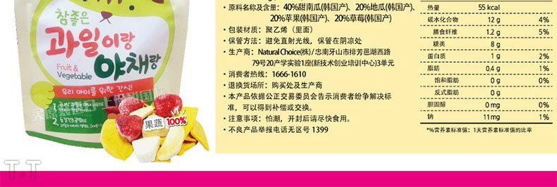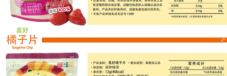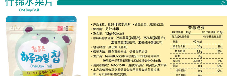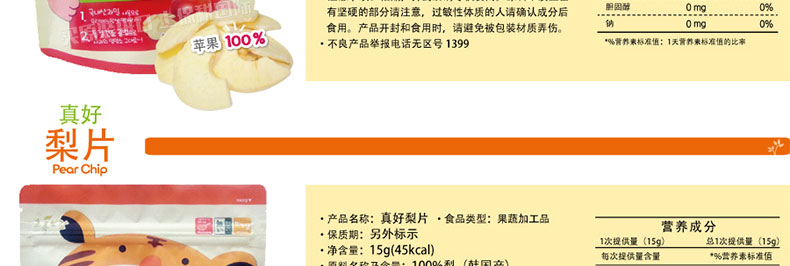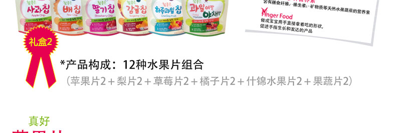 真好干果大禮包 水果干6種混合裝 蘋果片 梨片 水果蔬菜 草莓 橘子 什錦綜合果片 寶寶零食 6袋/盒 12袋/盒—— 1、蘋果片、梨片 、水果蔬菜15g/袋; 草莓、橘子、什錦綜合果片12g/袋。 2、禮盒1蘋果片、梨片、水果蔬菜、草莓、橘子、什錦綜合果片各1袋。 3、禮盒2蘋果片、梨片、水果蔬菜、草莓、橘子、什錦綜合果片各2袋。 |