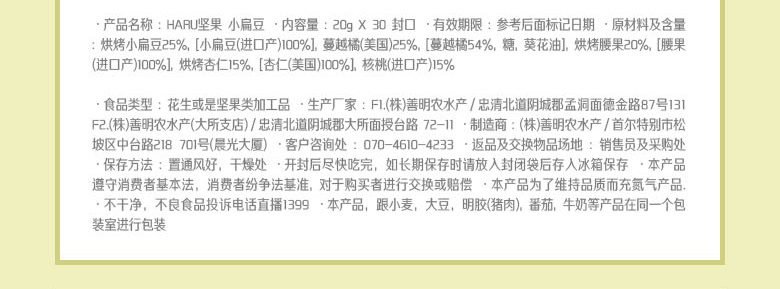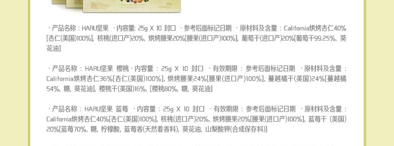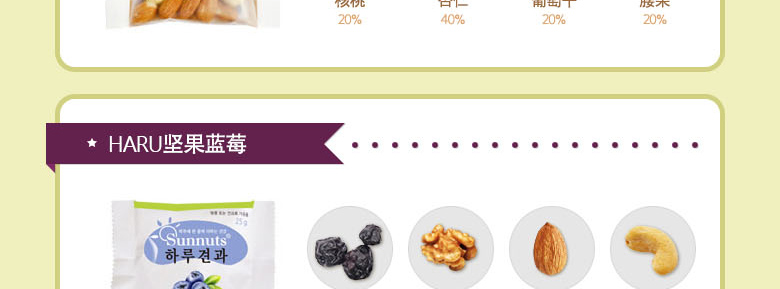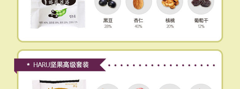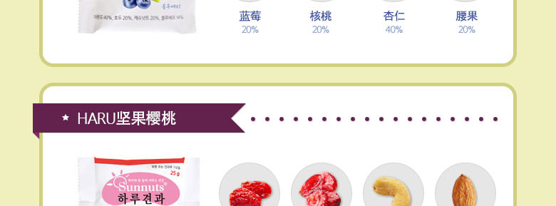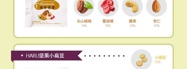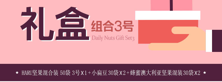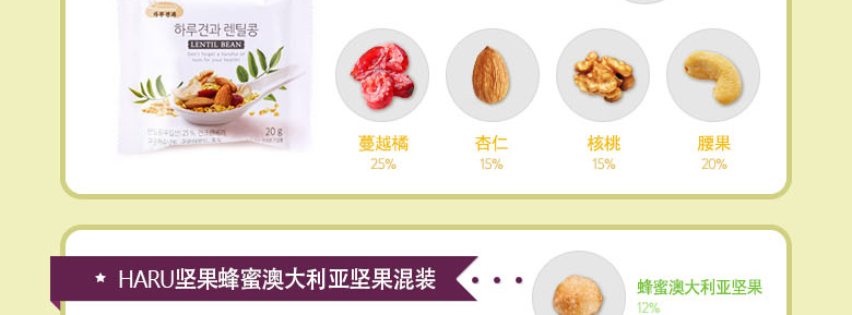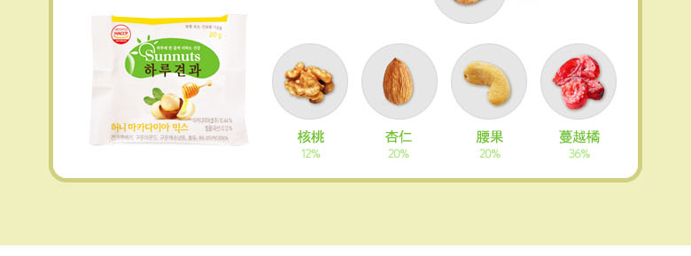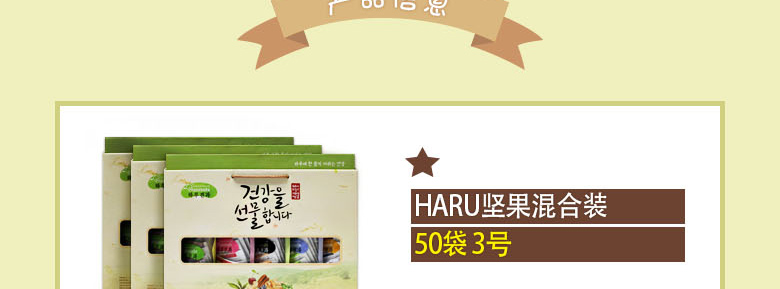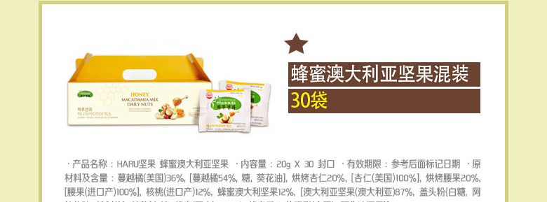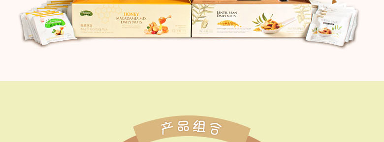 韓國SUNNUTS HARU天天堅果3號禮盒組合 營養美味 精美禮盒裝 3號混合裝*1 +小扁豆*2 +堅果蜂蜜混裝*2—— 1、3號混合裝包括:堅果原裝,堅果藍莓,堅果櫻桃各10袋。 2、澳大利亞堅果蜂蜜混裝10袋*2。 3、堅果小扁豆10袋*2。 |