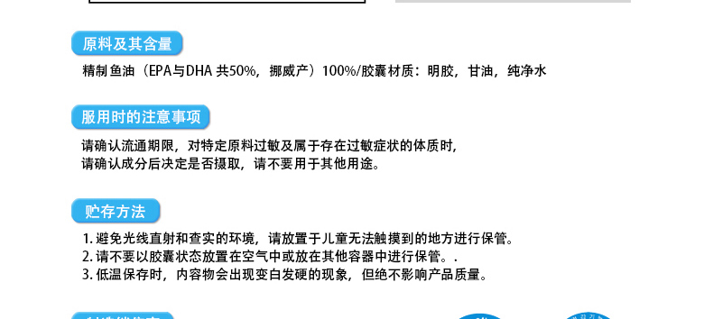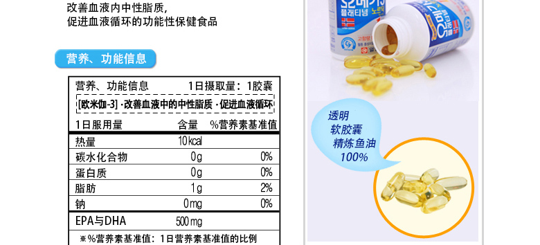 韓國一洋藥品挪威DHA深海魚油膠囊 歐米茄3鉑金挪帝克 一瓶裝四瓶裝 60粒/瓶—— 1、100%提取自挪威產(chǎn)純凈魚油。 2、含有豐富的EPA和DHA。 3、改善中性脂肪含量。 原料及含量: 精制魚油(EPA與DHA 共50%,挪威產(chǎn))100%/膠囊材質(zhì):明膠,甘油,純凈水等 |