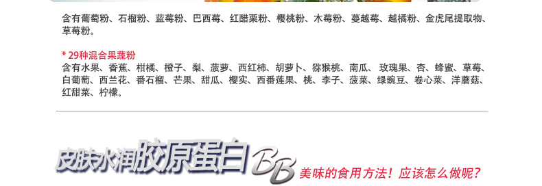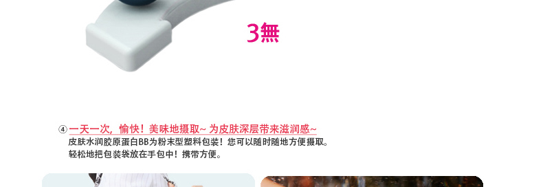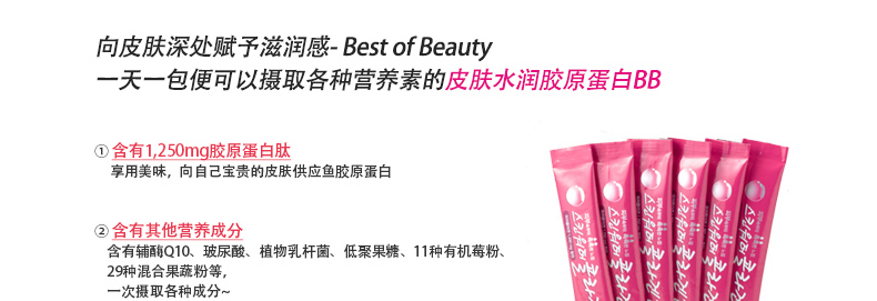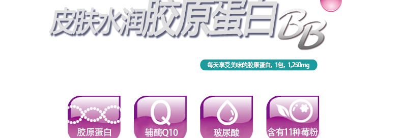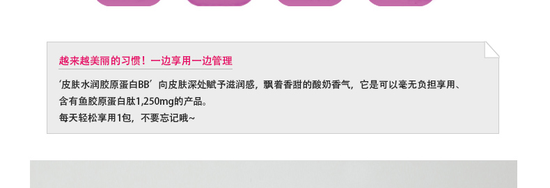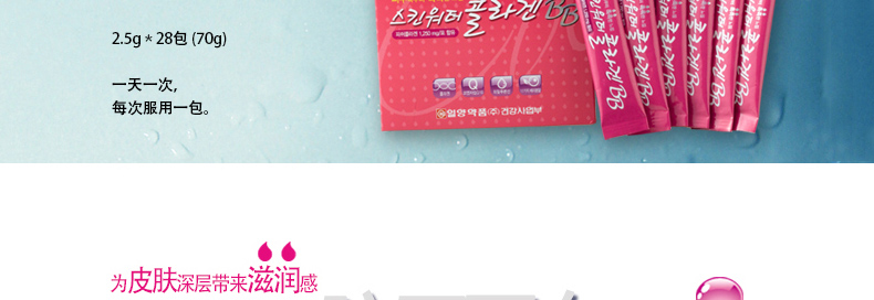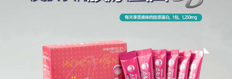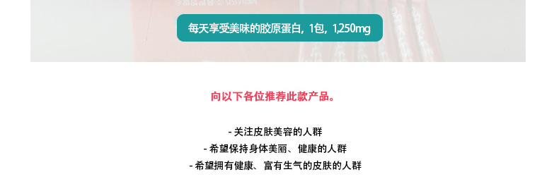韓國(guó)一洋藥品魚膠原蛋白肽膠原蛋白粉 香甜酸奶香氣 一盒裝四盒裝 28包/盒 —— 1、香甜酸奶味,可直接食用哦。 2、小包裝,干凈衛(wèi)生,方便攜帶。 3、無糖,無防腐劑,無合成色素。 原料及含量: 每包富含1250mg膠原蛋白肽; 含有輔酶Q10,玻尿酸,植物乳桿菌,低聚果糖,11種有機(jī)莓粉,29種混合果蔬粉等。 |