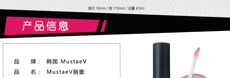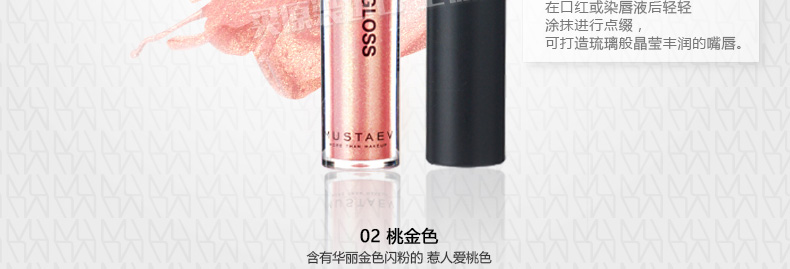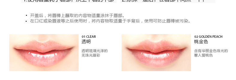 韓國 MustaeV唇蜜 01透明/02桃金色蜜金 光亮唇彩 4.5ml/支—— 1、01透明色唇蜜為透明琉璃光澤的天珠光唇彩。 2、02桃金色唇蜜含有華麗金色珠光的惹人愛桃色。 |
