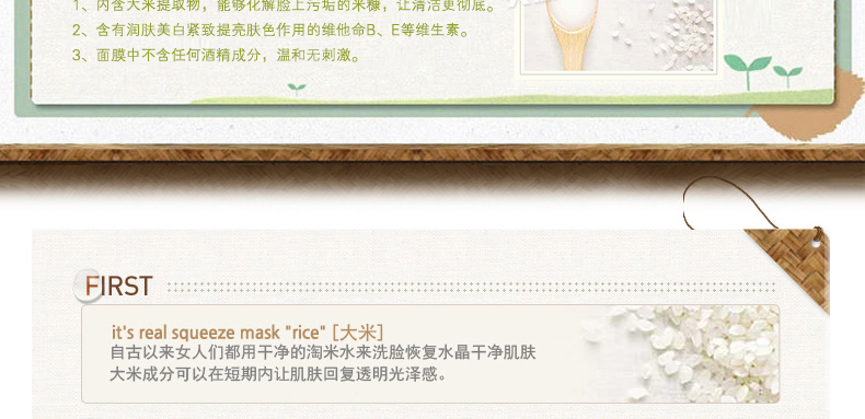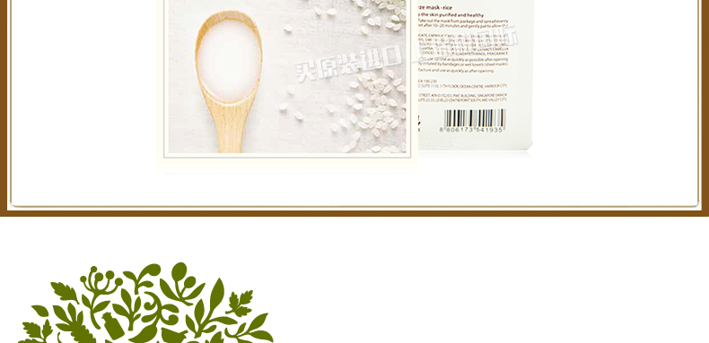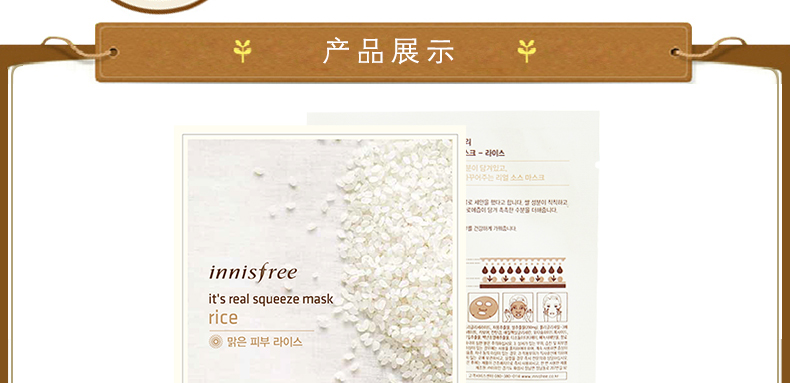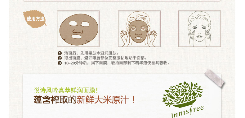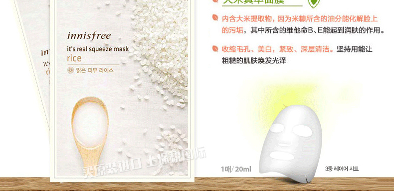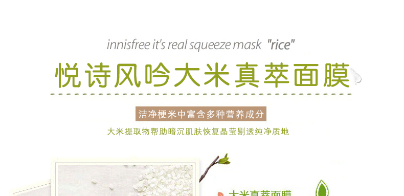 韓國悅詩風吟Innisfree大米面膜貼 皙白亮彩 補水祛黃緊致肌膚化妝品 20ml/片 10片裝 —— 1、內含大米提取物,能夠化解臉上污垢的米糠,讓清潔更徹底。 2、含有潤膚美白緊致提亮膚色作用的維他命B、E等維生素。 3、面膜中不含任何酒精成分,溫和無刺激。 |