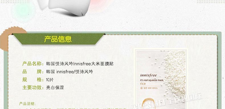 韓國悅詩風吟Innisfree大米面膜貼 皙白亮彩 補水祛黃緊致肌膚化妝品 20ml/片 10片裝 韓國直郵 |