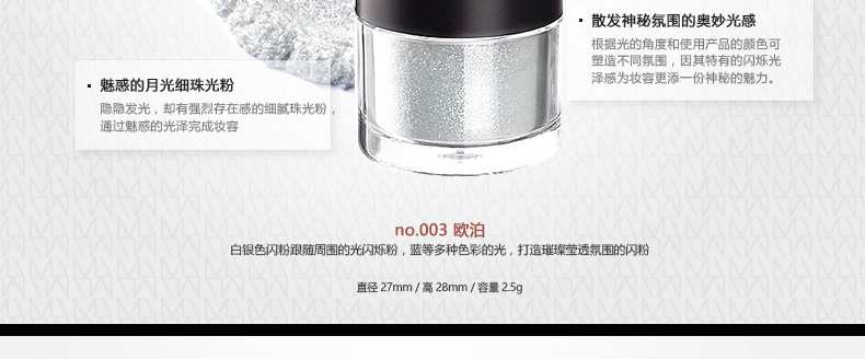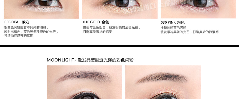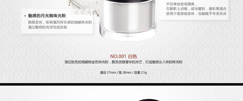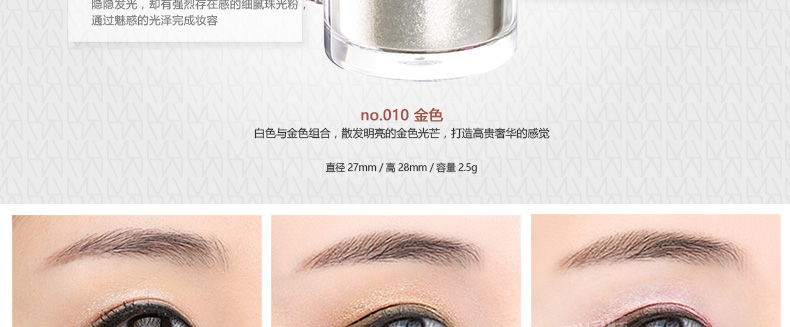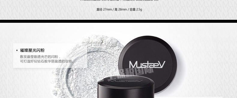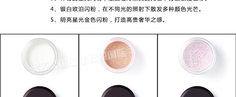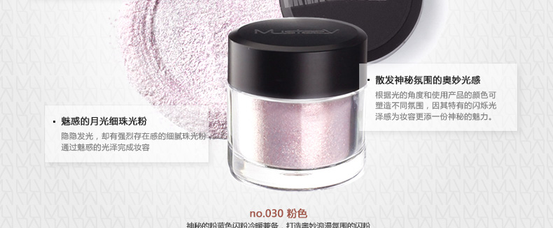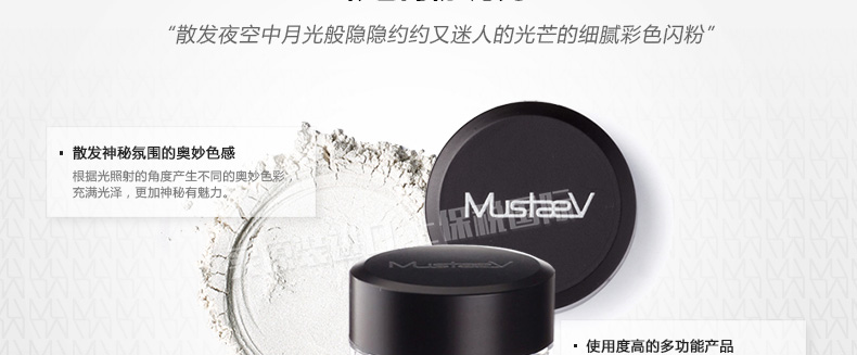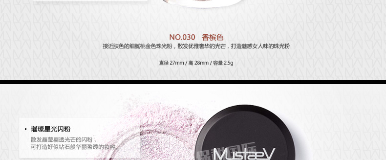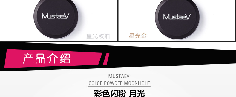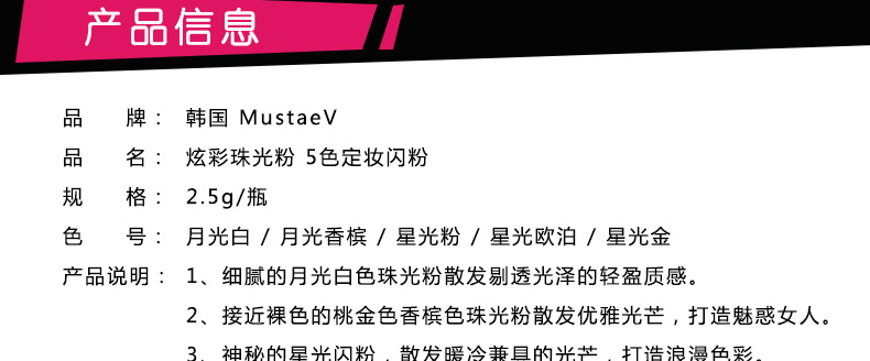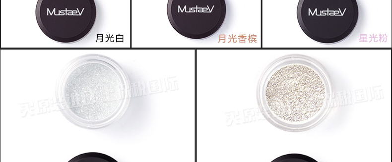 韓國 MustaeV 炫彩珠光粉 5色定妝閃粉 月光白月光香檳 星光粉 星光歐泊 白金色 2.5g/瓶 —— 1、細膩的月光白色珠光粉散發剔透光澤的輕盈質感。 2、接近裸色的桃金色香檳色珠光粉散發優雅光芒,打造魅惑女人。 3、神秘的星光閃粉,散發暖冷兼具的光芒,打造浪漫色彩。 4、銀白歐泊閃粉,在不同光的照射下散發多種顏色光芒。 5、明亮星光金色閃粉,打造高貴奢華之感。 |