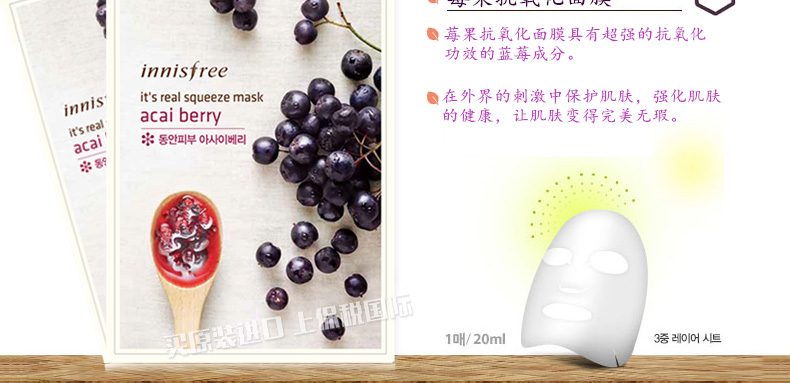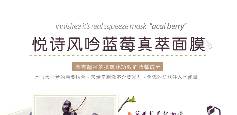 韓國悅詩風吟Innisfree藍莓真萃面膜貼 美白抗氧化 巴西莓果面膜 化妝品 20ml/片 10片裝—— 1、藍莓提取物,能夠化解臉上污垢的米糠,讓清潔更徹底。 2、3層滲透補水技術令面膜持久保濕,加強吸收。 3、面膜中不含任何酒精成分,溫和無刺激。 |
