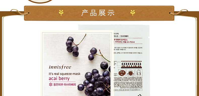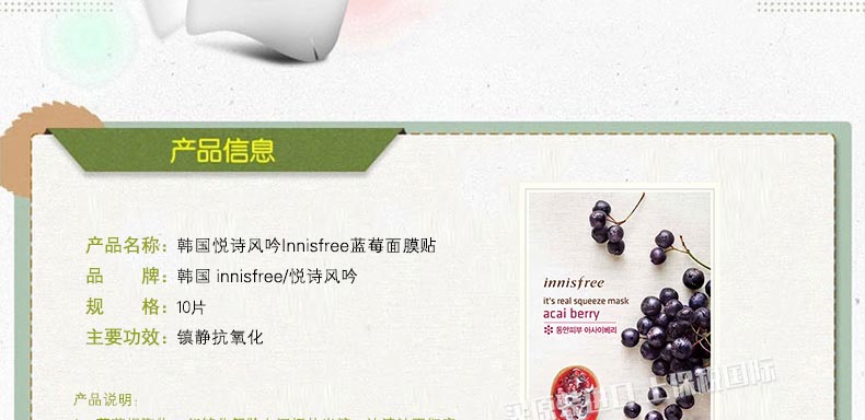 10片裝韓國悅詩風吟Innisfree藍莓真萃面膜貼 美白抗氧化 巴西莓果面膜 化妝品 20ml/片 【韓國直郵】 |