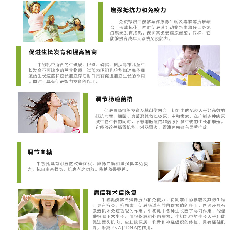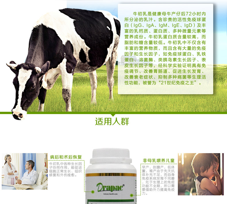 新西蘭牛初乳(免疫球蛋白IgG、乳鐵蛋白等)產自新西蘭無污染的天然牧場,經綠色喂養放牧的乳牛。初乳(Colos t rum) 是母體分娩后48小時內所產生之分泌的乳汁, 供給初生兒免疫因,成長因子、維生素、礦物質及氨基酸等以保證初生兒在脫離母體后能抵抗細菌、病毒侵犯而茁壯的成長。牛初乳所含免疫及成長因子IgG 的分子結構與人初乳的相似,很容易為人體所吸收,而含量卻比人體高出40倍之多。提高身體免疫力,增強抵抗
