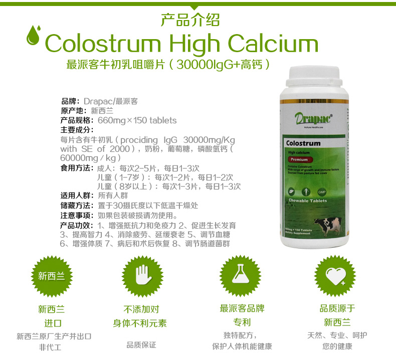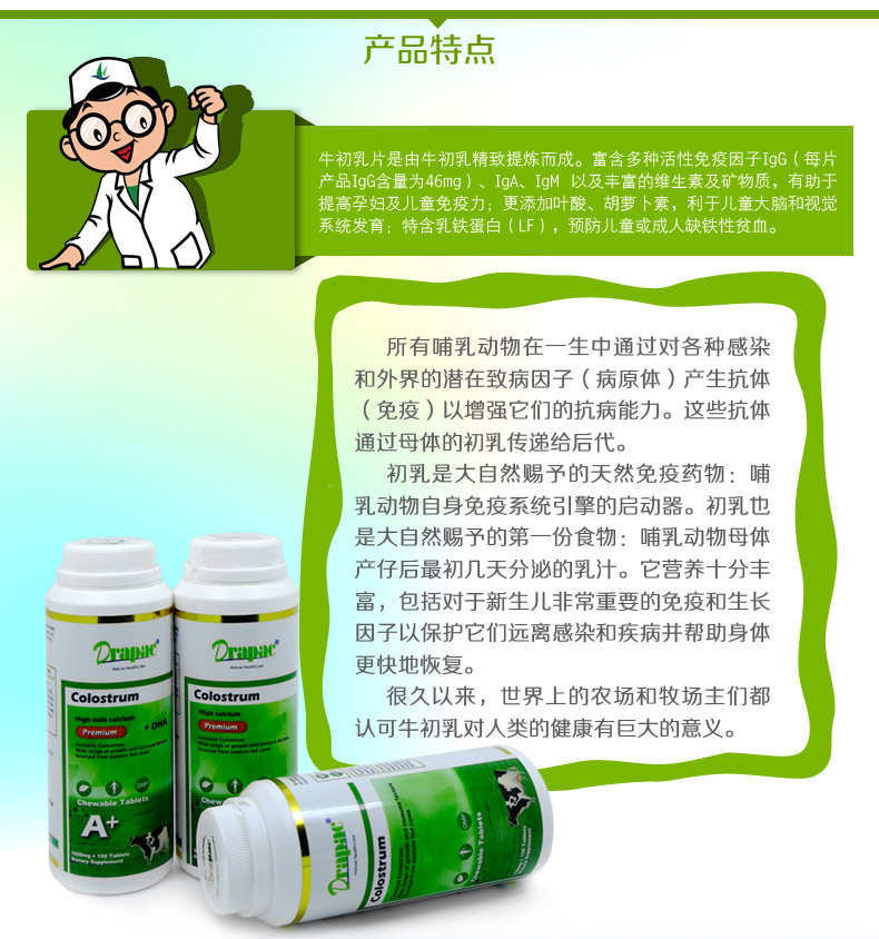 食品飲料、營養保健> 營養健康> 基礎營養> 【新西蘭直郵】DRAPAC/新西蘭最派客牛初乳片(30000 IgG+高鈣)150片提高身體免疫力 增強抵抗力
