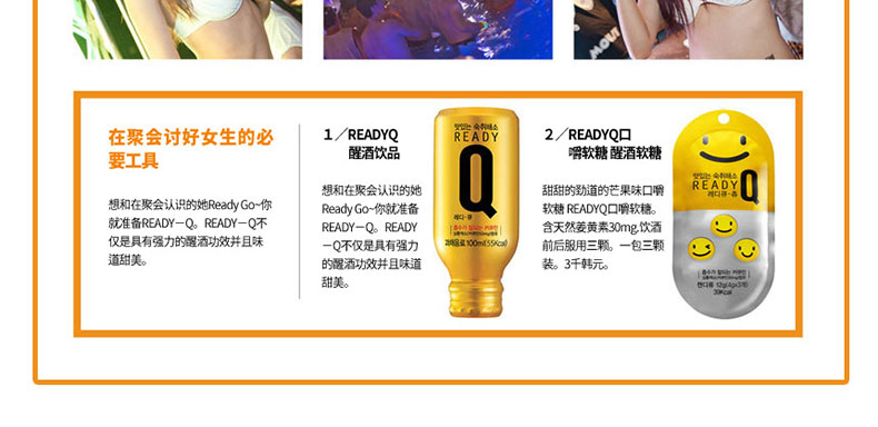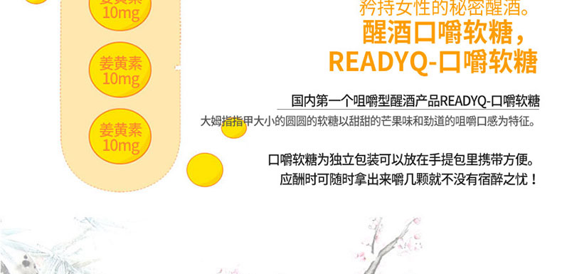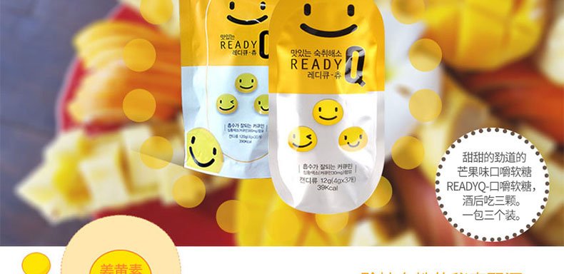 韓國HANDOK READYQ Chew芒果味解酒軟糖 醒酒解宿醉 3*10袋/盒—— 1、甜甜的芒果味口嚼軟糖。 2、飲酒后,吃3顆糖即可。 3、好吃,有效,便攜。 |