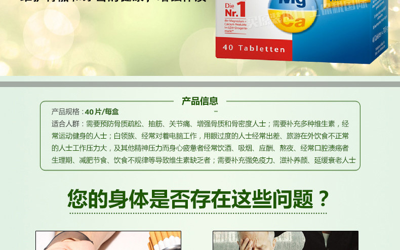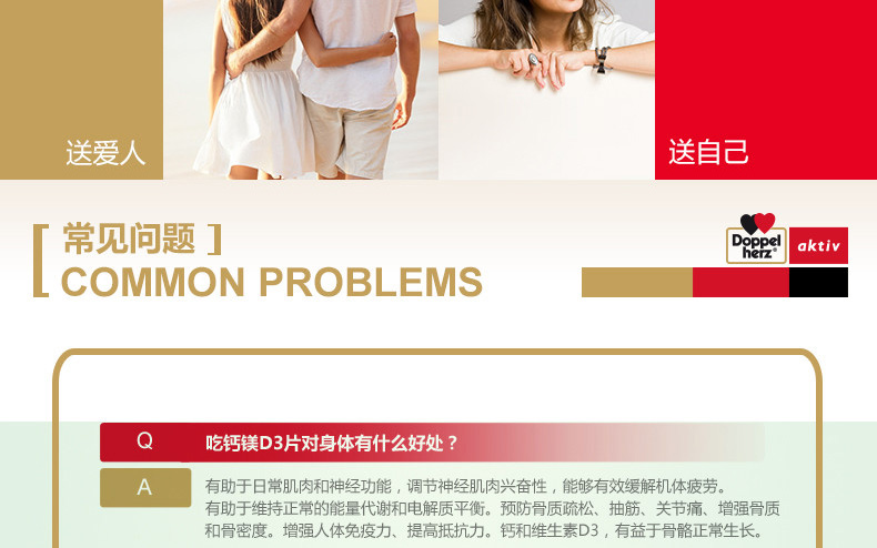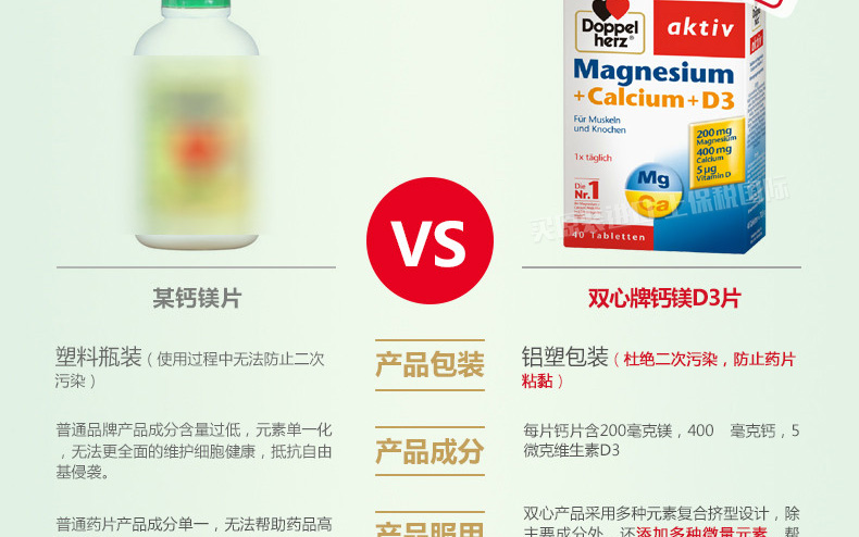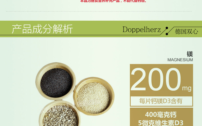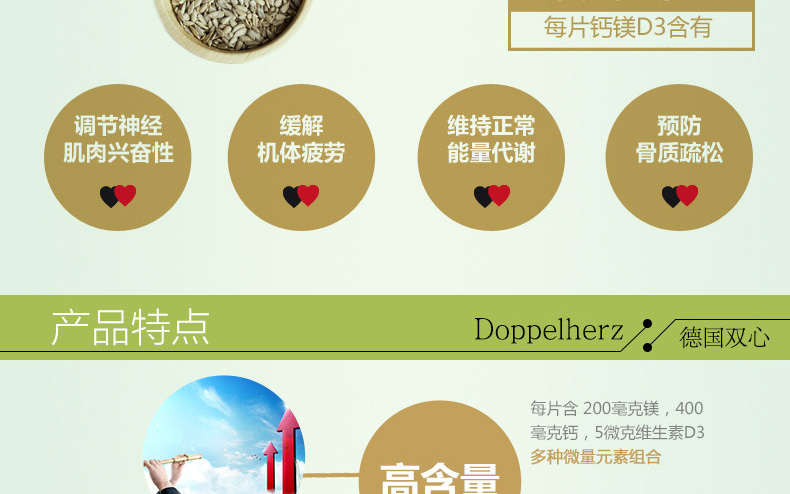 德國Doppelherz雙心 鈣鎂D3緩釋片 補充維生素防抽筋骨質疏松 每日1片用溫水送服 40片/盒—— 1.鎂和鈣都是人體必需的營養物質,被用于活化和維持人體內許多的生理過程。 2.鈣的吸收需要維生素D3,所以缺乏維生素D3如同缺乏鈣一樣,容易導致骨質疏松癥。維生素D3可以協助鈣質確實進入骨頭里。 |