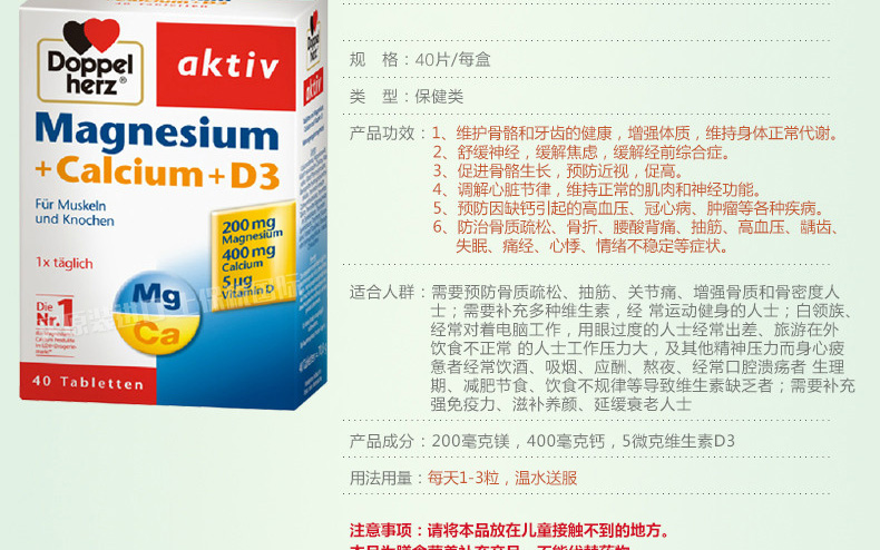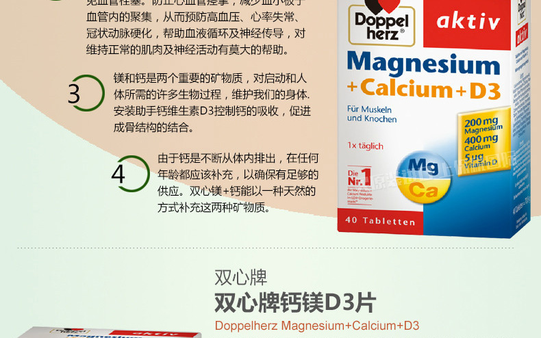 德國Doppelherz雙心 鈣鎂D3緩釋片 補充維生素防抽筋骨質疏松 每日1片用溫水送服 40片/盒 |